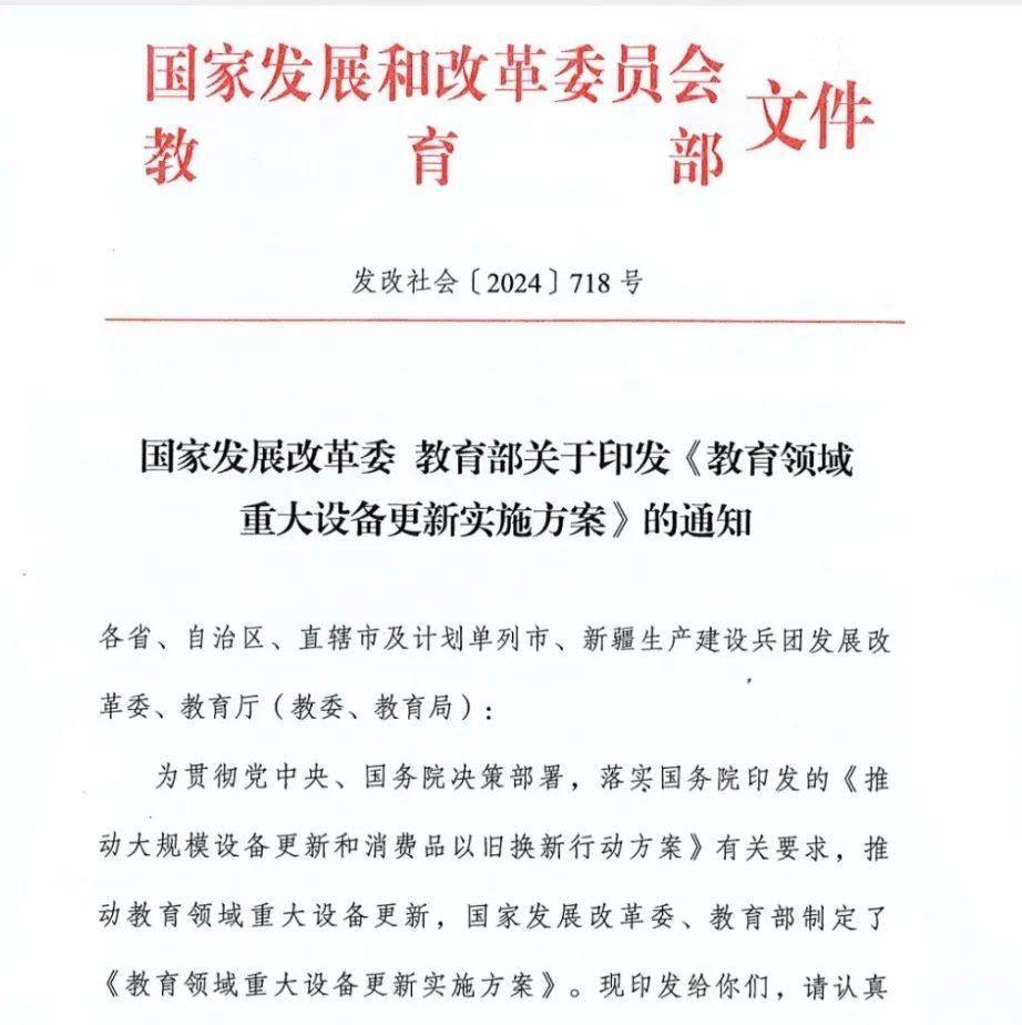 为贯彻党中央、国务院决策部署,落实国务院印发的《推动大规模设备更新和消费品以旧换新行动方案》有关要求,推动教育领域重大设备更新,特制定本实施方案。